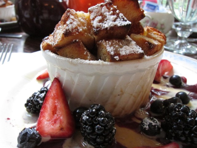 The brunch menu had a lot of choices, including the regular tea service; however, while I did want tea, I wanted something more breakfast-like and so I decided to go with French Toast. The toast was infused with apricot brandy and it also had fruit coulis, vanilla creme anglaise and a few berries alongside.